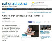 ニュージーランド南島クライストチャーチ市で起きた大規模地震の被災者取材のため、同市内の病院に入り込もうとした日本人記者2人が地元警察に拘束された。ニュージーランドのメディアが24日報じた。